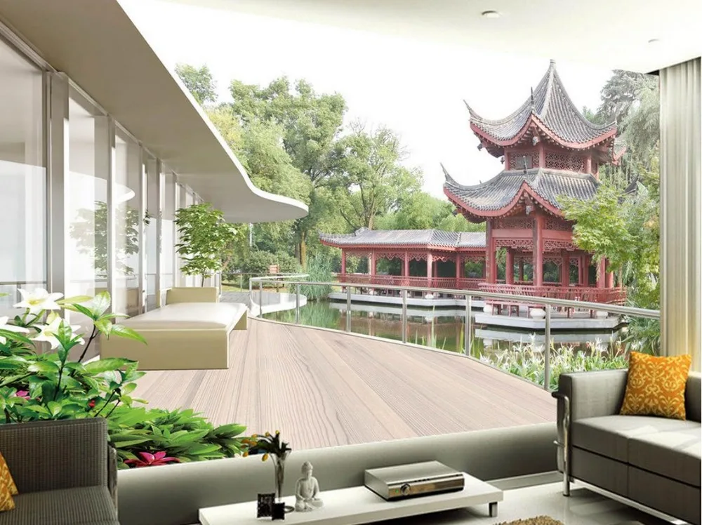 Lukisan Pemandangan Cina 3d Latar Belakang Balkon 3d Stereoscopic
